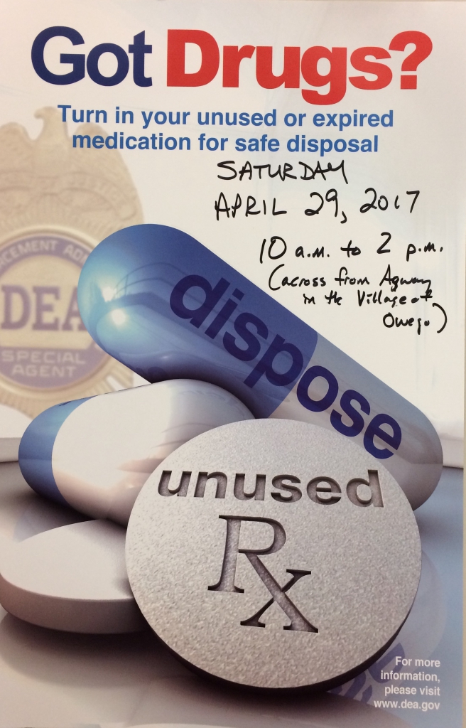 On Saturday April 29, 2017, the Tioga County Sheriff’s Office will again be participating in the semi-annual National Drug Take Back Event sponsored by the Drug Enforcement Administration. This event will be held at Trinity-CASA (formerly TCCASA), in the Old Depot Building across from Agway in the Village of Owego. Please bring any unused, unwanted, or expired medications you wish to dispose of. We cannot accept liquids or needles of any kind.