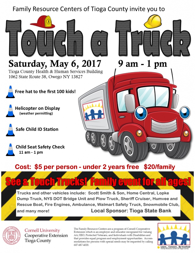 Family Resource Centers of Tioga County invite you to their annual Touch a Truck event on May 6, 2017. The Sheriff's Office will be showing off their Police Cruiser, Humvee and Rescue Boat at this event. The Sheriff's Office will also be operating the Operation Safe Child ID station. This Safe Child ID is FREE! To learn more about the Safe Child ID, visit our website by clicking here: